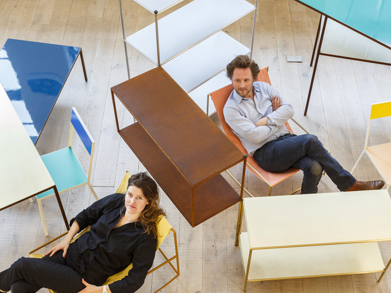 Colour me beautiful: Fien Muller (left) and Hannes Van Severen take time out from installing an exhibition of their new furniture and lighting. Hosted by Clerkenwell contemporary furniture showroom Viaduct, the exhibition featured brightly coloured tables, storage, seating and lights.