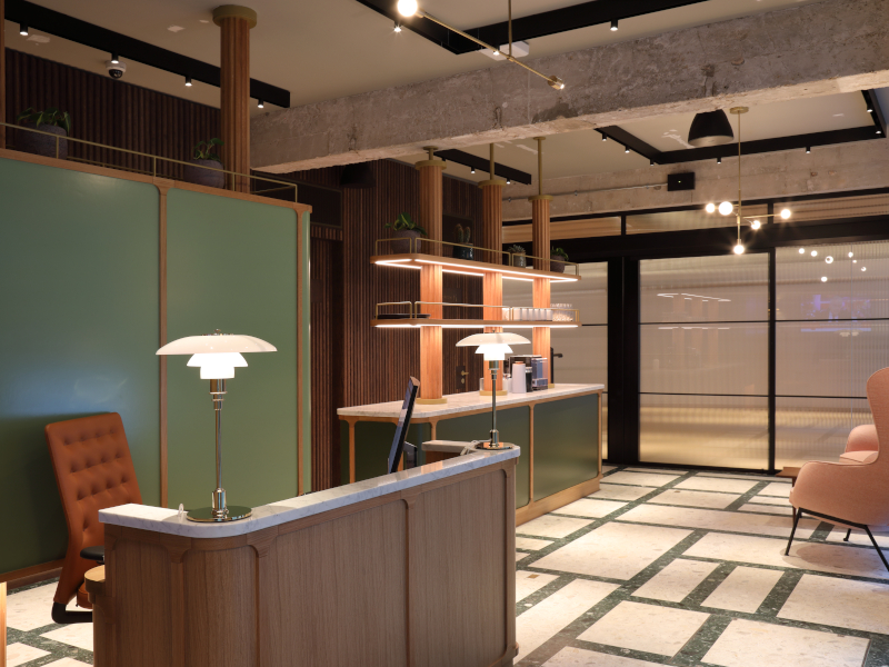 The entrance to 6 Babmaes Street features a grid of turquoise and white terrazzo floor tiles, with a curved timber reception desk and arrival lounge setting the tone for the spaces above.
