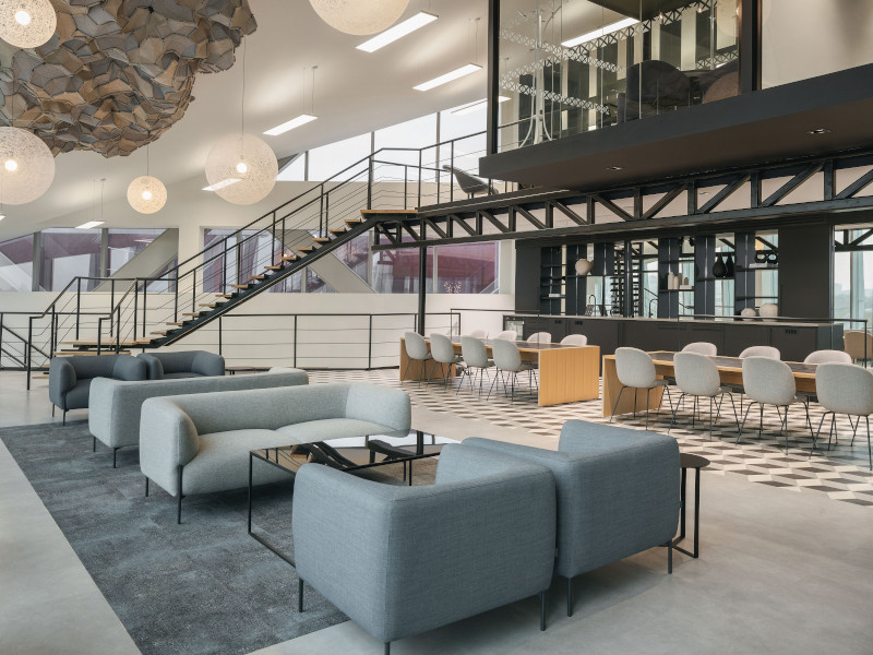 Sitting alongside this working zone, Quebec from the Karndean LooseLay range has been used to create a restful seating area and walkway to the board room at the rear of the mezzanine. Opting for extra-large scale tiles (1,000×1,000mm) in a block pattern has resulted in a realistic poured concrete effect.