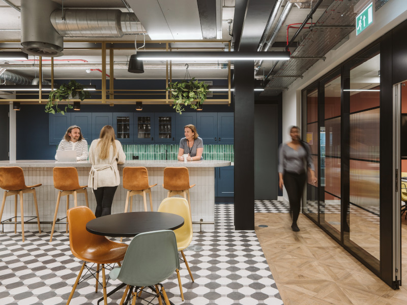 Flora Sharp, designer at Thirdway, says: ‘Lee & Thompson are no ordinary law firm. Their clients in media and sport are used to the delights of London’s members clubs and they wanted the office to emulate this. The geometric flooring was specified to add colour and eyecatching detail; reminiscent of tiled flooring, the boldpattern colours complemented the blue cabinetry. The individual hexagonal shapes also allowed us to create a bespoke design layout.’