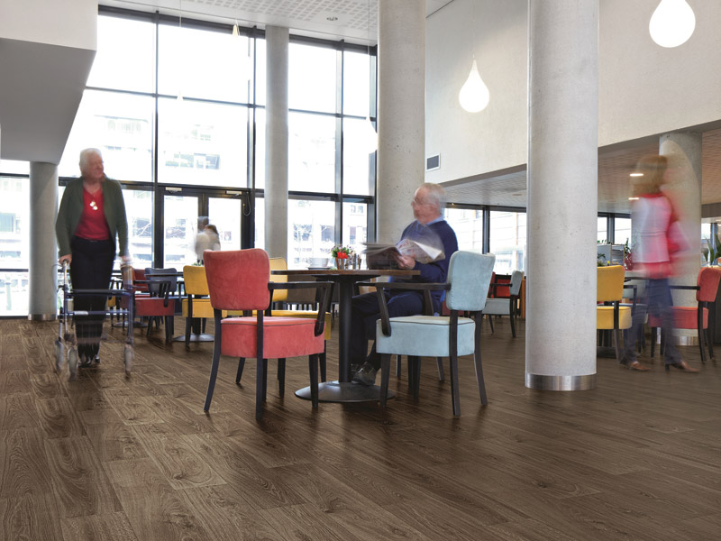 There’s also a danger that in trying to eliminate every possible risk, architects will end up specifying a floor that looks totally institutional – and that too has its risks when it comes to care home residents. All the research suggests that people stay more active for longer if the place they are living is more like a home and less like a hospital. Tarkett’s research paper Designing Supportive Care Homes notes: ‘As a living space, the care home should have a comfortable, domestic feel without institutional cues.