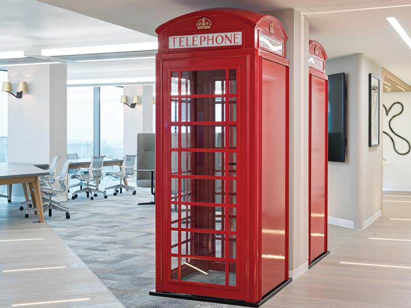 It was primarily an advertising tool, but the flooring subconsciously guided pedestrians to set down in the square instead of blocking main circulation routes in front of ticket gates. The same idea can be applied in workplace design, and we used a similar approach on our projects for Worldwide Technologies and Asynchrony Labs in the Citi building, Canary Wharf. Here, dynamic partition lines define rooms and demo areas which are enhanced with flowing lines of changing flooring finishes and mirroring ceiling treatments emulating these lines above.’