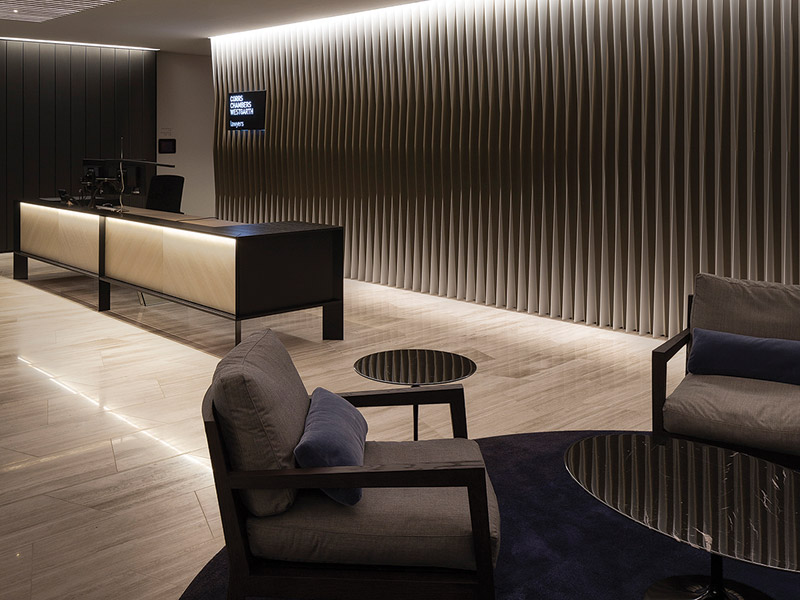 Part of an upgrade project for the Perth branch office of legal firm Corrs Chambers Westgarth, the lighting scheme is an exercise in integration, restraint and precision, winning an IALD Award of Merit. The reception features a system of custom aluminium bars, or blades, with three finishes, which radiate from behind the reception over the ceiling and down the opposite wall.