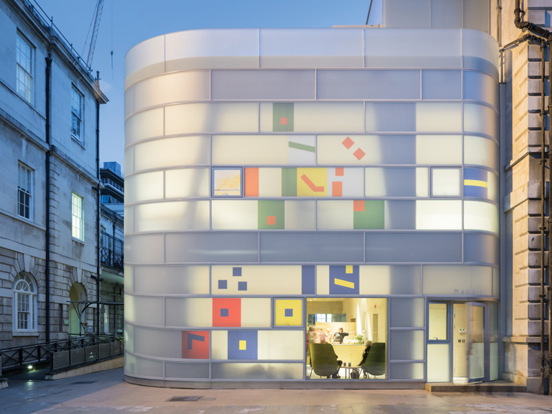 Maggie’s centre at Barts, designed by Steven Holl Architects, has an inner layer of bamboo and an outer layer of matt-white glass with coloured-glass fragments inspired by ‘neume notation’ of medieval music, reflecting the heritage of the 12th-century hospital. Image Credit: Iwan Baan