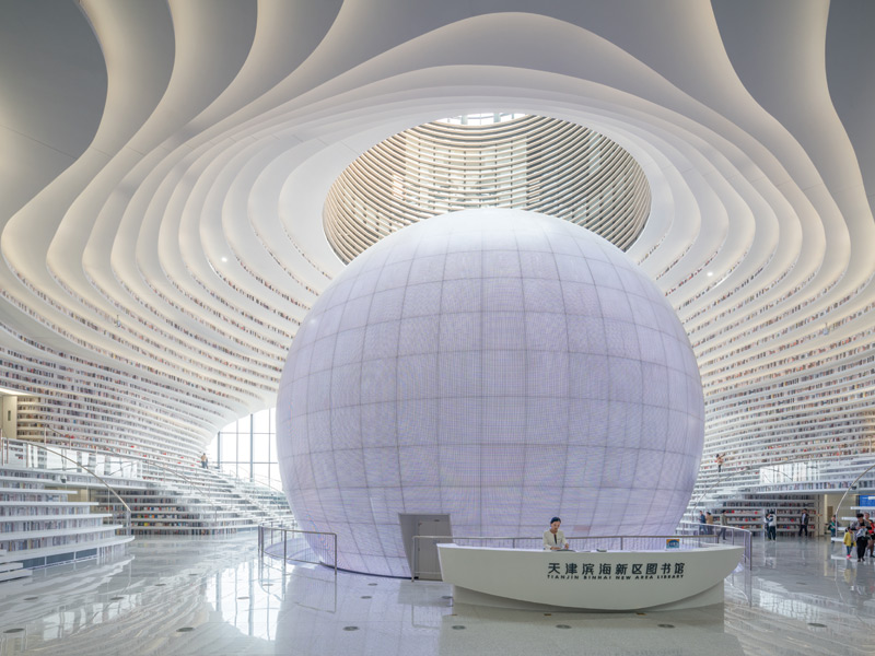 MVRDV, in collaboration with local architects at TUPDI, created China’s Tianjin Binhai Library, a 33,700 sq m cultural centre including a spherical auditorium and seemingly endless shelves mixing real books with aluminium graphics in hard-to-reach areas. The scheme also includes meeting rooms and educational facilities. Image Credit: Ossip