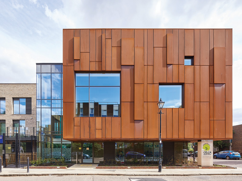 ‘The teachers were used to just opening the door when they were getting hot and they wanted to retain that similar “ground-floor feel” on the upper floors,’ says Mainwaring. The solution was to create functional, opening doors fully protected by louvres. ‘If you get too hot you can just open the door – it’s as simple as that,’ he says. ‘You get all the natural air coming in, but you can’t fall out.’ The natural ventilation on the exterior of the building, which helped the project to gain BREEAM Excellent status, is cunningly concealed behind bespoke, perforated panels of Cor-ten weathering steel that naturally rusts to a warm, earthy tone, complementing the London Stock brick.