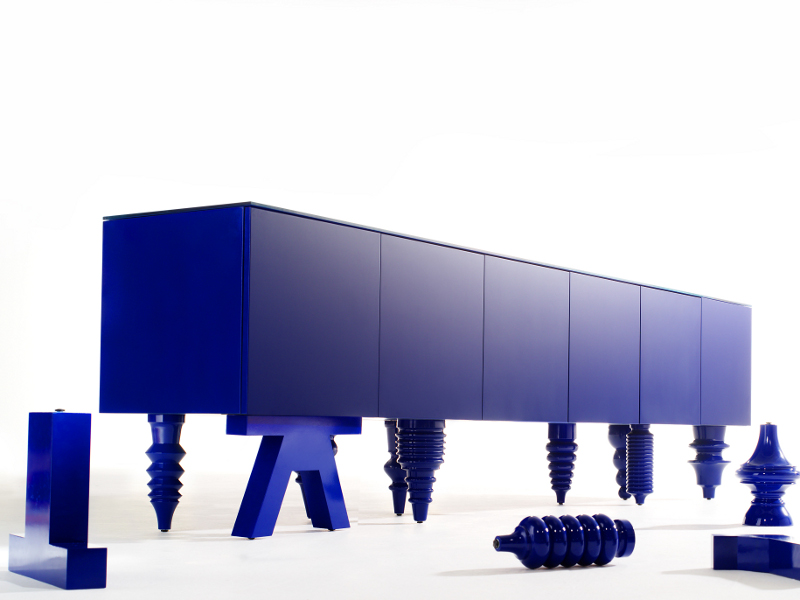 Questioning the logic that tables and sideboards be supported by the same boring simple legs, arranged symmetrically, Hayon created a delightfully anarchic looking range of furniture whose legs range from simple utilitarian blocks to intricate spirals of varying sizes.