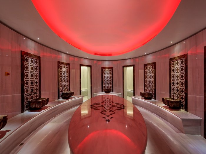 Part of the design brief was to create a spa, with more than 3,300 sq m dedicated to wellbeing with 14 treatment rooms, indoor and outdoor pools, gym and hammam (pictured above). Other features of the hotel include stateof- the-art digital check-in screens, outdoor terraces, and the Cloud 34 lounge bar. Located on the top floor, it maximises views over the city and the Bosphorus.