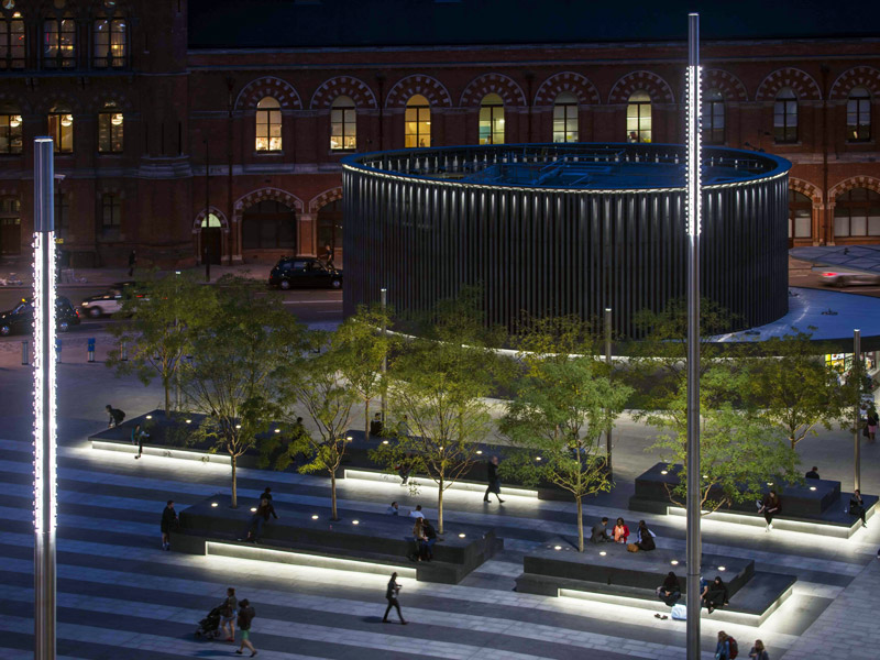 Part of the £550m redevelopment of King's Cross, King's Cross Square has had major structural changes. The scheme now reveals the brick facade of Lewis Cubitt's 1852 railway station behind a 7,000 sq m plaza. Architecture practice Stanton Williams replanned the station entries and exits to ease movement, and incorporated three large London Underground services structures. These are clad in the same granite as the plaza and incorporate a variety of service functions and retail activities. The lighting remit included the main square, new entrances, and exits and colonnades from King's Cross platforms.
