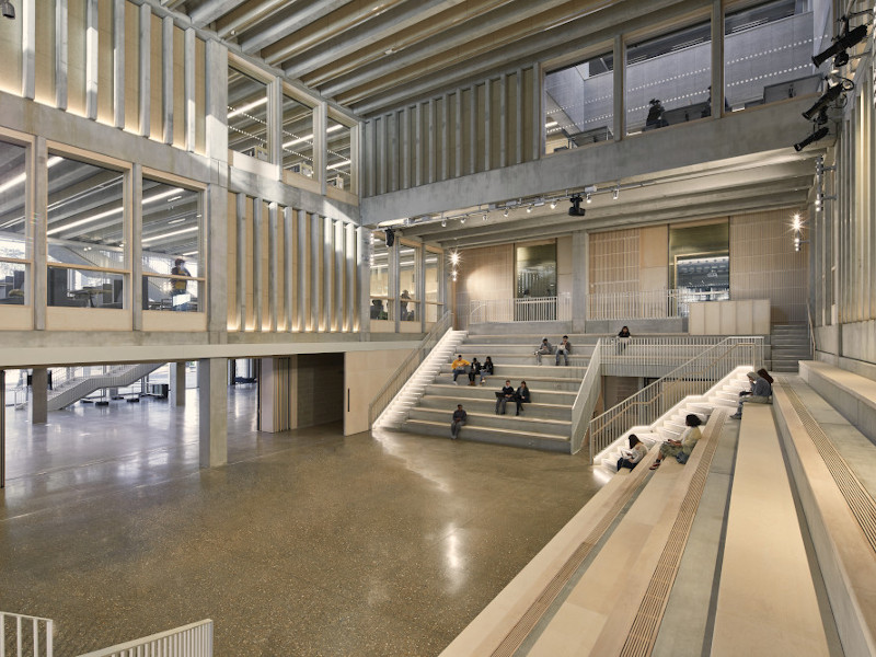 The largest (semi-)enclosed space is ‘The Courtyard’, which might more conventionally be called an auditorium. Instead of a closed-off and underused black box, as auditoriums often are, this large light-filled area will be open all the time and is suited for informal use, its rows of benches fitted with powerpoints. Its name comes from the way it cuts through three floors – like a courtyard. It is open to the outside via a ‘minstrels’ gallery’, and doors fold back to open it entirely to the foyer on the ground floor, while above it’s looked in on via glass cut-outs across the upper floors.