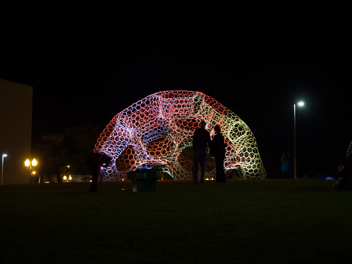 The SOL Dome was installed as part of the 2013 Fall In...Art and Sol Festival in Michigan. A lightweight structure weighing just 40kg, it measured 8m across and was 4m high. It was constructed from thousands of individually woven circles of a composite fibre of carbon and fibreglass called Archilace, developed by Loop.pH.