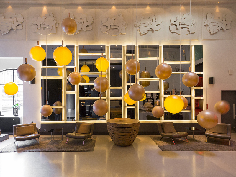 Commissioned by Champagne brand Veuve Clicquot and the Andaz hotel group, the abstract installation is called Dive into a Glass of Veuve Clicquot Champagne, and comprises five giant glowing spheres of which five are projected out of sculptures filled with high pressure air so that they float and bob in the air.