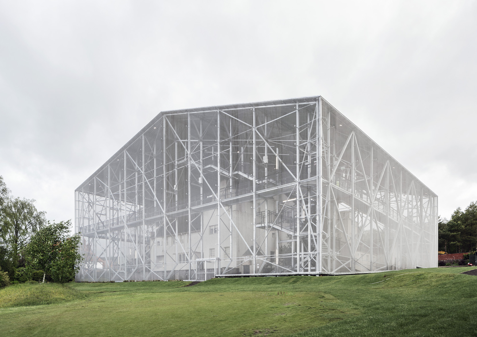 165 tonnes of steel scaffolding form the Hill House Box, surrounding Charles Rennie Mackintosh’s The Hill House (1902–4). Credit: Johan Dehlin