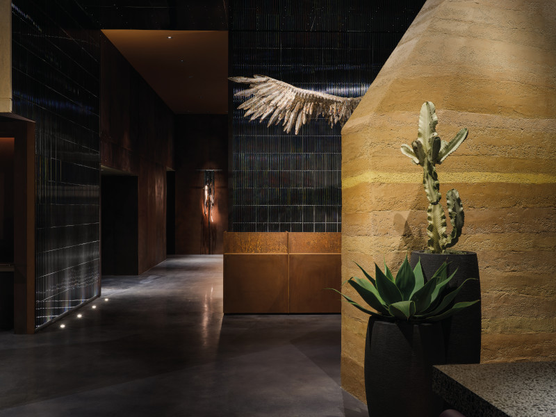 Guest rooms feature a custom copper-coloured mosaic wall, inspired by the glow of a desert sunset. Yabu Pushelberg leaned into this warm, crimson-and-cedar palette and worked with materials such as copper that gently reflect and refract light. The guest room headboards are made from distressed green leather, telling the stylish story of a well-worn leather motorcycle jacket. Custom handlebar sculptures hanging on the wall provide a modern interpretation of taxidermy.