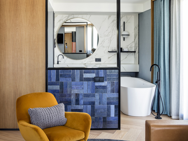 In terms of colour, the design team honed in on just two of the multitude of colours on display in the city: the warm terracotta tones of its architecture, and the fresh blue tones of the Mediterranean Sea. As in an abstract art composition, the team brought together two colour blocks to the Vividora rooms, with warm leather headboards in the sleeping area contrasting with the colder, blue, crafted ceramic dividers of the bathroom area.
