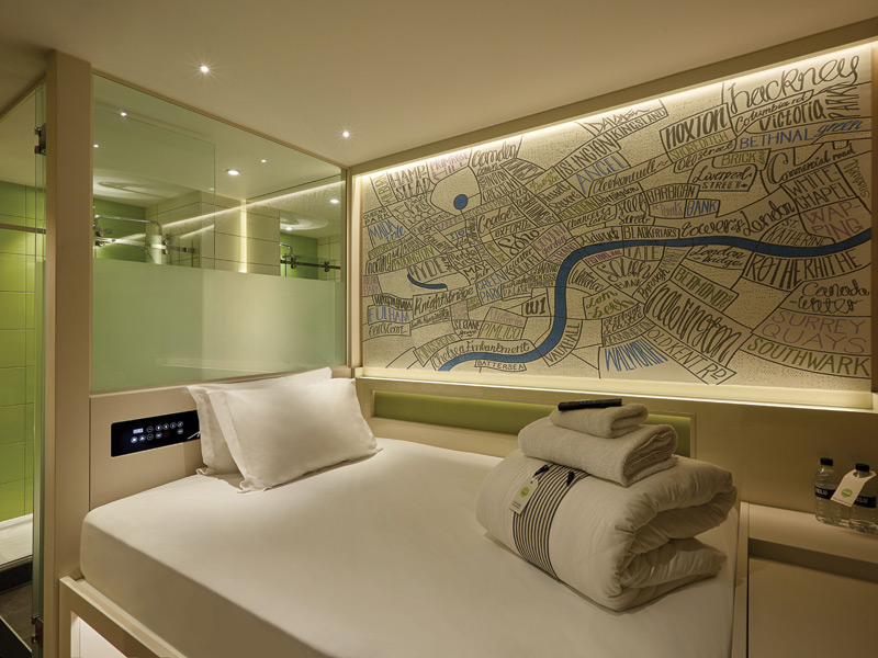 'We were given the brief to create an iconic room to house double occupancy in the "hotel of the future", knowing that space in London and other cities is at a premium,' says JSJ Design partner Simeon Thompson. Although the rooms have a template design created to get the maximum from the smallest space, they are neither capsules nor cabins. 'As a designer JSJ is obviously aware of other brands and their execution, but that helped the client understand what was possible and what could be done with perhaps a bit more comfort,' says Thompson.