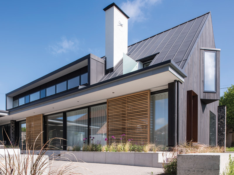 The zinc roof’s dark colour continues into the cladding, with strips of stained cedar echoing local barn buildings. Image by: Grant Smith