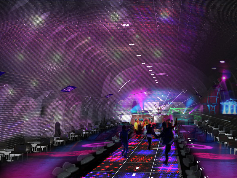 The mischievous experimentation allied with social responsibility and humour characterise the combined talents of Laisné and Rachdi, and they are in evidence under ground in their proposals for those abandoned stations. Their ideas, presented to some astonishment, ranged from refectory-style restaurants to auditoria, art galleries, theatres, nightclubs, gyms, even overlong swimming pools and a subterranean garden. Places to relax, train, perform, create, exhibit and eat, in a series of old/new, familiar/unfamiliar surroundings, there could be a real cache to this urban experiment, if the idea could be made to happen. The potential range of leisure development could be brought to areas that currently lack such facilities.