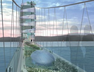 Built accommodation would largely clustered around the bridge's two main towers, where it would avoid excessively loading the suspension cables. Additional lightweight accommodation could be suspended below the old roadway, allowing the creation of a green, linear park along the length of the bridge.