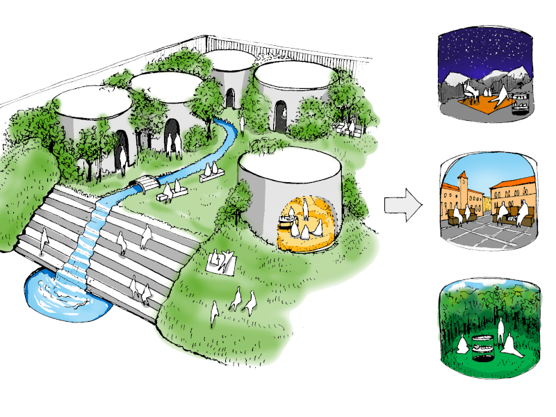 INSTEAD OF finding your way to your usual table, you could be immersed straight into the atmosphere of another country, especially if you’re unable to get there in person and are longing to experience an Italian piazza in the summer, for example, or a woodland Black Forest picnic or a Swiss mountain-top dinner. Oasis pods would recreate each environment, with controlled heating and lighting to match the feel of the destination and wraparound light walls and ceilings playing real-time film from the desired location. There would be no counters or queues, with all prep and admin contained in a separate service area. Food – embodying and expressing the location – would be served through a hidden platform rising up from the ground. A cost- eff ective and planet-friendly way to sample culinary delights from far and wide.