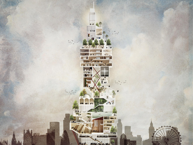 I would like to see this concept explored in a city like London. Rather than just sticking a cafe or bar on top of a commercial tower to satisfy the planners, let’s repurpose an office tower as a high-rise city block, a vertical Wardour Street or Brick Lane. A building with places to live, work, play and worship. A building that generates its own power and food, planted decks that clean the air and provide sanctuary. A diverse and meritocratic quarter that would not slide into Ballardian anarchy.