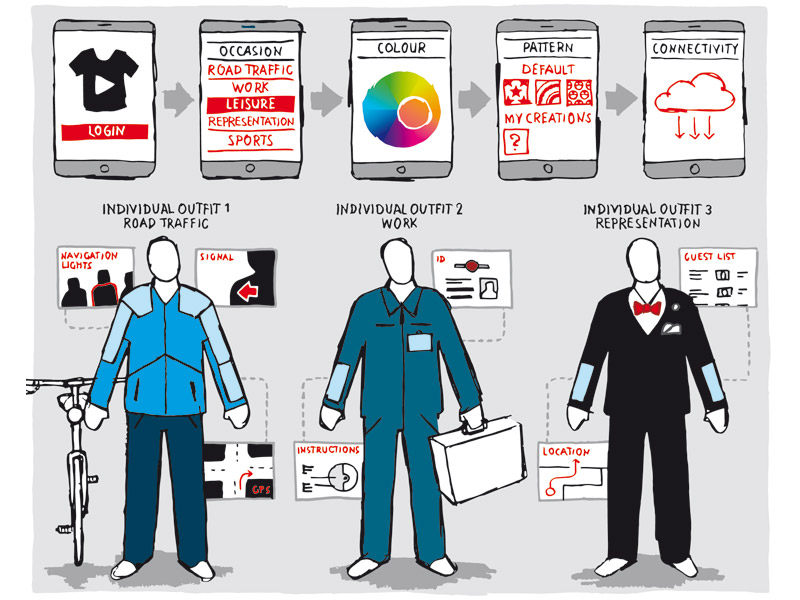 Our clothes could have safety features on demand, such as automatic turn signals for bikers, emergency signalling in case of an accident, or just light up in the dark for better visibility. As soon as you hop off your bike or get out of your car you just 'switch' from casual to tuxedo, so you'll blend right into the gala crowd. The shirt you picked this morning feels wrong? Just tweak it to your wish. Wetsuits could adapt to the surrounding and protect surfers and divers. A wearer wants a brand's logo bigger or smaller? Just change it.