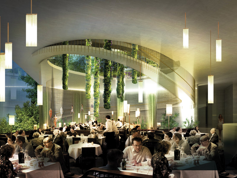 The connection from ballroom to roof garden would be through a catwalk-like, large spiralling staircase where we could parade models surrounded by the lit hanging gardens during Fashion Week, have the bride walking down the spiralling aisle at her wedding, have acrobats perform along the stair or abseil themselves down the hanging gardens at special events. The central garden atrium would also act as a stage for performances, with the public being able to view them from the auditorium like roof garden.