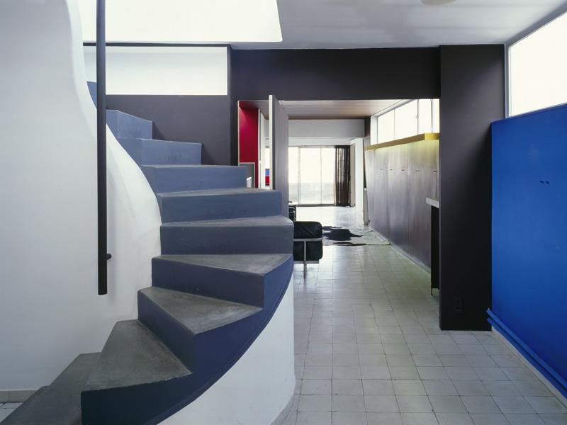 The doors - to the kitchen, the maid's room, the atelier and the central spiral staircase - offer an efficient system of avoidance. This way, the maid could enter the kitchen without having to walk through the apartment, and Le Corbusier could access his atelier without encountering his wife. Once inside, this system of access and evasion is perhaps more aesthetically generous, with two pivoting doors separating either the atelier from the apartment, or the apartment from the central spiral staircase where guests would climb to their rooftop quarters and terrace. The result is a series of shifting perspectives according to the requirements of the space, true to Le Corbusier's theory of 'la promenade architecturale'.