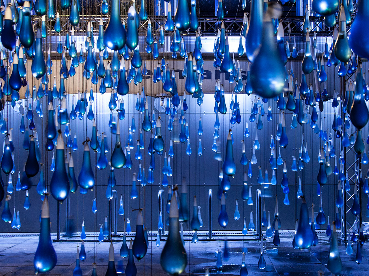 The condoms were filled with blue water and lighted before being strung from the ceiling. This formed a cubic space that people could walk through as they entered the Totally Thames festival.