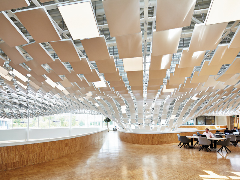 Practising what it preaches, Philips Lighting has applied intelligent lighting principles to the refurbishment of its Fifties’ headquarters in Eindhoven, the Netherlands. Laboratory for Visionary architecture (LaVa) devised an interactive Led light ‘tree’ with 1,500 reflective ‘leaves’, suspended pyramidal panels that generates naturalistic light and shadow in the building’s new atrium/gathering space. Some 500 panels use self-emitting Philips ecophon Soundlight – an integral product that consists of comfortable Led lighting with sound absorption in an integrated light and acoustic ceiling system.