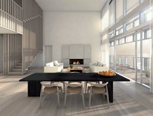 Pawson has used finishes and detail to create interiors of maximum comfort, functionality and aesthetic pleasure. Living areas have floor-to-ceiling windows and bleached teak flooring throughout, including the balconies and terraces. Each residence has custom-designed, open kitchens and master bathrooms with Italian white onyx translucent screens and custom-cast, integral concrete baths and sinks.