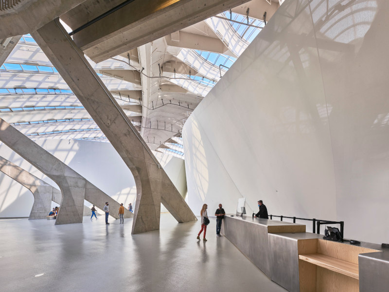 Kanva’s reimagining of the Biodome introduces soaring white curved walls, dividing the plan while opening the space to the Taillibert ceiling above. These new large-scale additions, with their smooth white surfaces, contrast with and highlight the dramatic structural concrete supports of the original building.