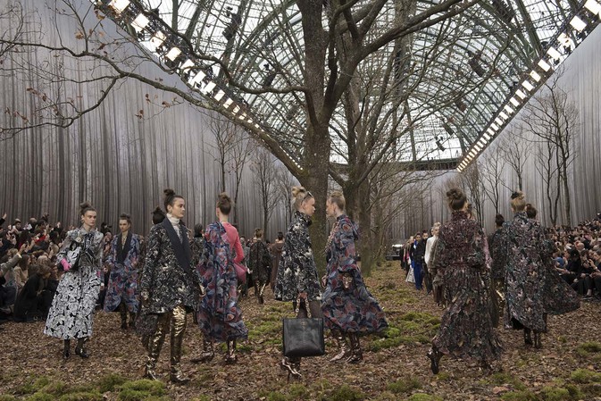 The audience sat on benches constructed from tree trunks, and real moss and fallen leaves gave the show an authentic, earthy smell and atmosphere. Meanwhile, models paraded the runway and were evidently dressed to fit in with the surroundings; the show featured branch-like braids, jewelled buttons chiselled with leaves, suitors of beads and pastel-hued glass paste.