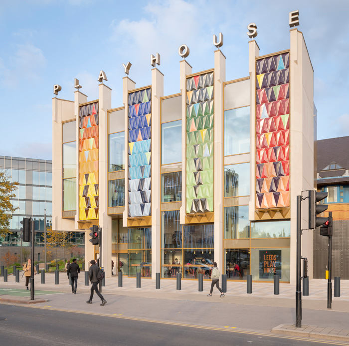 The new entrance increases the theatre’s presence on St Peter’s Street despite it being small in stature in comparison to neighbouring buildings. The eye-catching facade of brightly coloured 3D ceramics helps communicate the creative message of the Playhouse, but it also links back to a local tradition of ceramic and faience rooted in the Burmantofts Pottery, which exported its colourful ceramics globally from this region. Burmantofts closed in 1957, and so the 3D tiles came instead from Lancashire-based Darwen Terracotta and Faience.