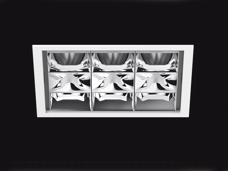 The multiple downlight combines up to nine individually controllable, small 2x2cm LED light inserts. Each has varying emission characteristics and colour temperatures (3,000K and 4,000K) to provide multiple lighting options. The fitting features square or circular reflectors, generating either round or angular light projections, or an asymmetric wallwash reflector that delivers a perfect three-to-one ratio. There is also an anti-glare version (UGR <19), for use with VDU workstations. The micro-faceted reflector technology was developed with the highly respected 60-year-old Austrian lighting specialist Bartenbach. The aim was to bring together precise light control with high efficiency and minimal glare.