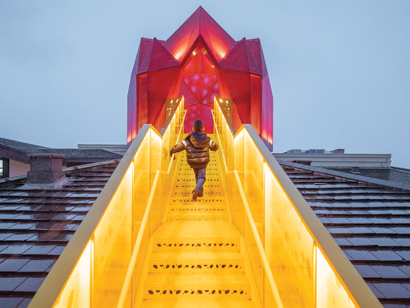 Sitting on top of the roof and reached by an exterior yellow staircase is a red house-like structure built with double-perforated aluminium panels. Internally illuminated, it acts as a beacon for the surrounding area.