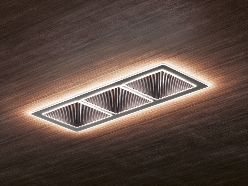 A further innovation is that the optics can be set in two alternative positions according to the type of ambient light required. When the optics are extended, the lit section of the fitting gives the impression of being suspended a few centimetres from the ceiling. The halo projected onto the ceiling stretches from the luminaire like a shadow, reinforcing the idea of levitation. When not extended, the fitting has a more discreet appearance and creates a halo closer to the luminaire on the ceiling, producing illuminated reference points to animate the space.