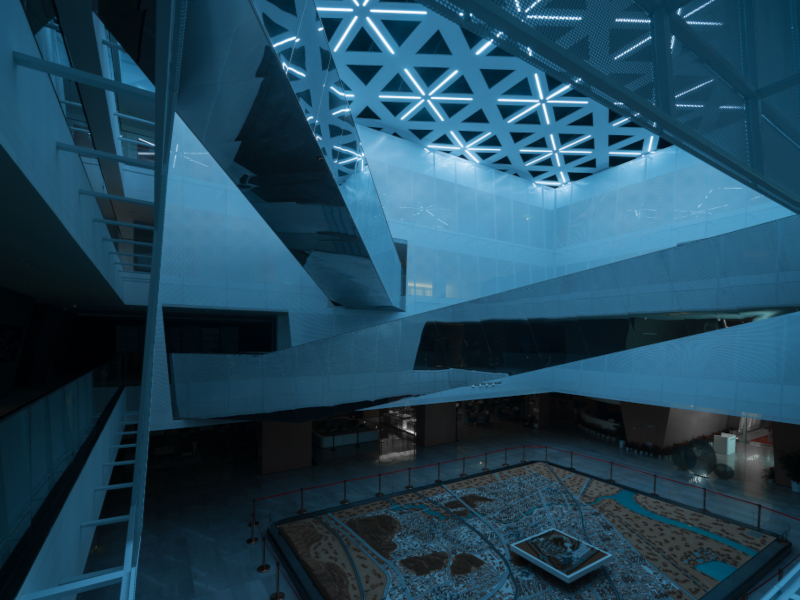 Shuifa Geographic Information Industrial Park Exhibition Centre, designed by AOE with lighting by Puri Lighting Design. Image Credit: WILLIAM YAO