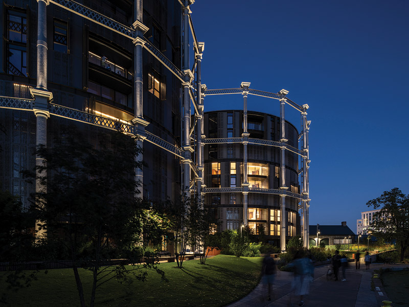 Refurbished by Yorkshire-based Shepley Engineers, and relocated to their current position beside the Regent’s Canal, they have emerged some 150 years later as a RIBA Award-winning scheme comprising 145 apartments set within the three linked gasholder guide frames.
