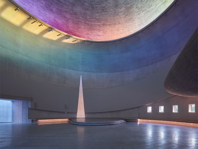 The annular window that creates the effect is located just below the roof, hidden behind a wide ledge. The source of the light is strategically veiled, suggesting the mysterious and the divine. The colours evoke the Biblical post-diluvian covenant of the rainbow.
