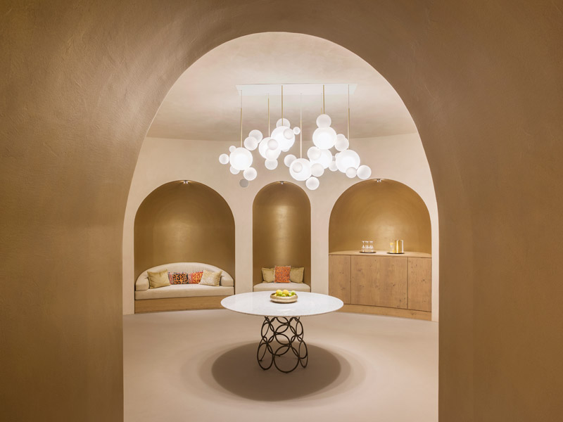 The communal rooms and corridors of the Euphoria Retreat take design cues from Byzantine archways and contemporary lighting, with a focus on low-contrast illumination. Image Credit: Margarita Nikitaki