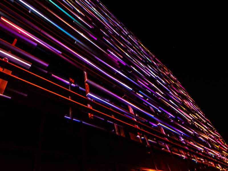 Apparently random patterns of light were programmed to create dynamic, colourful scenes, accentuating the horizontal linear architectural detail on both buildings. Special scenes can be programmed for festivals or national holidays. Bespoke fixtures were designed with a new base, which contains the built-in DMX-RDM electronic driver, completed with in-out connector for plug-and-play connection (the custom version has since become a standard product). The lighting is connected via a fibre-optic cable to create controlled scenes on both buildings simultaneously.
