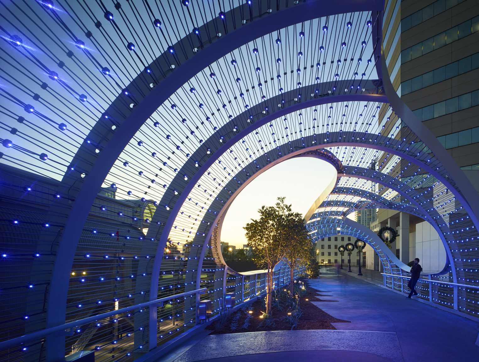 The reason for the project was that two major venues in Long Beach – the Convention Centre and the Performing Arts Centre – needed a connection that allowed attendees to circulate freely between both venues.Previously, visitors had to navigate flights of stairs and traverse the dangerous stretch of road known as Seaside Way, which was largely characterised by loading docks. At first, the solution to this issue was to build an elevated sidewalk, but this was then changed to the Rainbow Bridge design – a 600 foot pedestrian bridge framed by 76 custom welded bent-steel ribs.