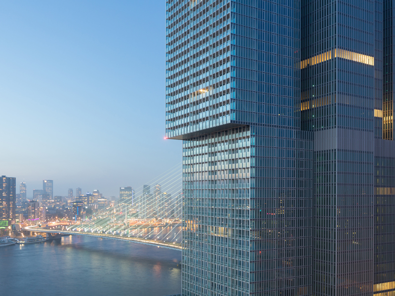 Impressive is one word to describe OMA's transparent agglomeration, dominating the waterfront of historic Wilhelminapier in Rotterdam's Kop van Zuid district. Perplexing is another, both for its tricksy geometry and in terms of whether the building itself makes sense after its stop-start history, tracking 16 years from design to completion. The development comprises a gross floor area of 162,000 sq m, including 72,000 sq m of office space, 240 apartments and a 285-room hotel. Each tower houses up to 45 floors; the total cost is stated as €340m. These numbers don't reflect the current demands of Rotterdam, where up to 70 per cent of office space lies fallow and the residential market is stagnant. Commissioned in 1997, at a peak of European optimism, the project came to an abrupt halt in 2001. OMA's associate in charge, Kees van Casteren, links this directly to the events of 9/11. The client had their confidence shaken, he says, and the work stopped. Since then, conservative changes have been made to the design -- apartment sizes came down and double-height floors were dropped in favour of more saleable space. Work recommenced in 2006, construction followed from 2009 and the building is finally 'delivered' this November, into a very different world.