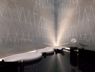 Guest rooms feature white leather walls and black lacquered cabinets that incorporate TVs and entertainment systems and back-lit onyx shelves. Discreet lighting is integrated, including the Lumina FLO table light designed by Foster + Partners.