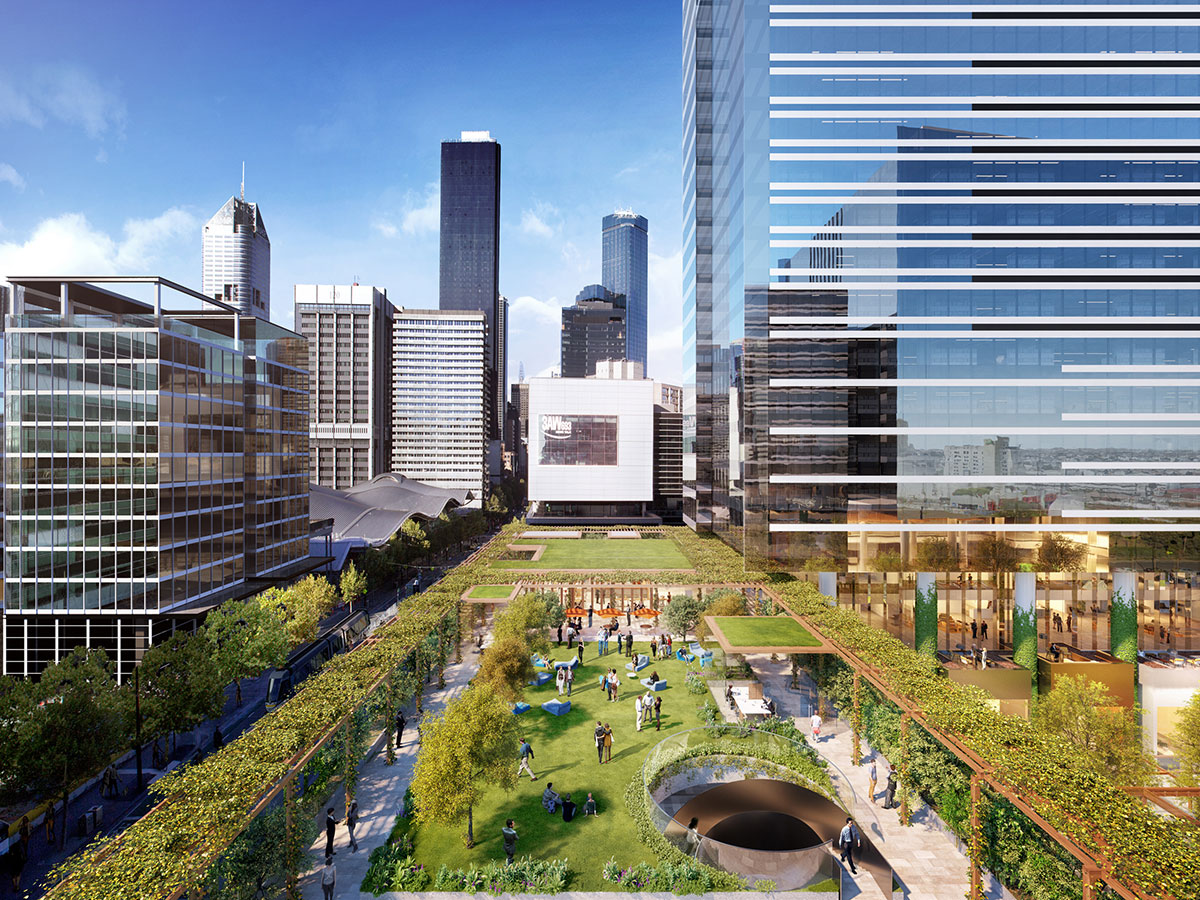 The 25,000sq m space will be opposite Southern Cross train station, bordered by Flinders and Collins Streets and is set to host city living, dining, innovative workplaces, dining, shopping and green public spaces.