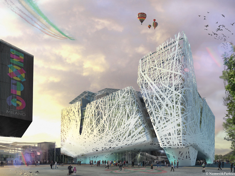Located on the Cardo, one of the two perpendicular axes of the Expo site, Italy's pavilion takes its inspiration from an 'urban forest'. Its facade, otherwise hiding a simple glass box, is marked by an intricate spider's web-like lattice. Inside, an internal piazza represents the starting point of the exhibition as well as the symbolic heart of the complex. Above it hangs a giant, conical skylight. The rest of the building is divided up into four volumes housing exhibition spaces, an auditorium, offices, and conference and meeting rooms, with a panoramic terrace on the top.