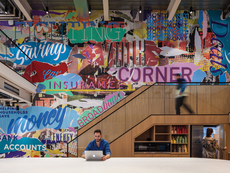 BDG decided to move away from surface-level branding – such as colouring the space in the brand colours as the client had done previously – and looked to evaluate their shared ‘DNA’ instead. BDG boiled this down to four keywords: ‘honest, simple, down-to-earth and upbeat’. This is generally reflected in the materials, choosing wood for both the kitchen fit-out and staircase, although a hero piece of the project is a large commissioned artwork by Acrylicize that spreads across the central space of the three floors. The brightly coloured design – a composite collage of roughly layered slogans drawn from each of the brands – resembles a billboard’s history of layered ads, ripped and exposed. Though perhaps surprisingly lo-fi for a tech company, as Childs points out, this is a nice metaphor for a central element of the business: persuading customers to decide how best to spend their money when faced with everything the market has to offer.