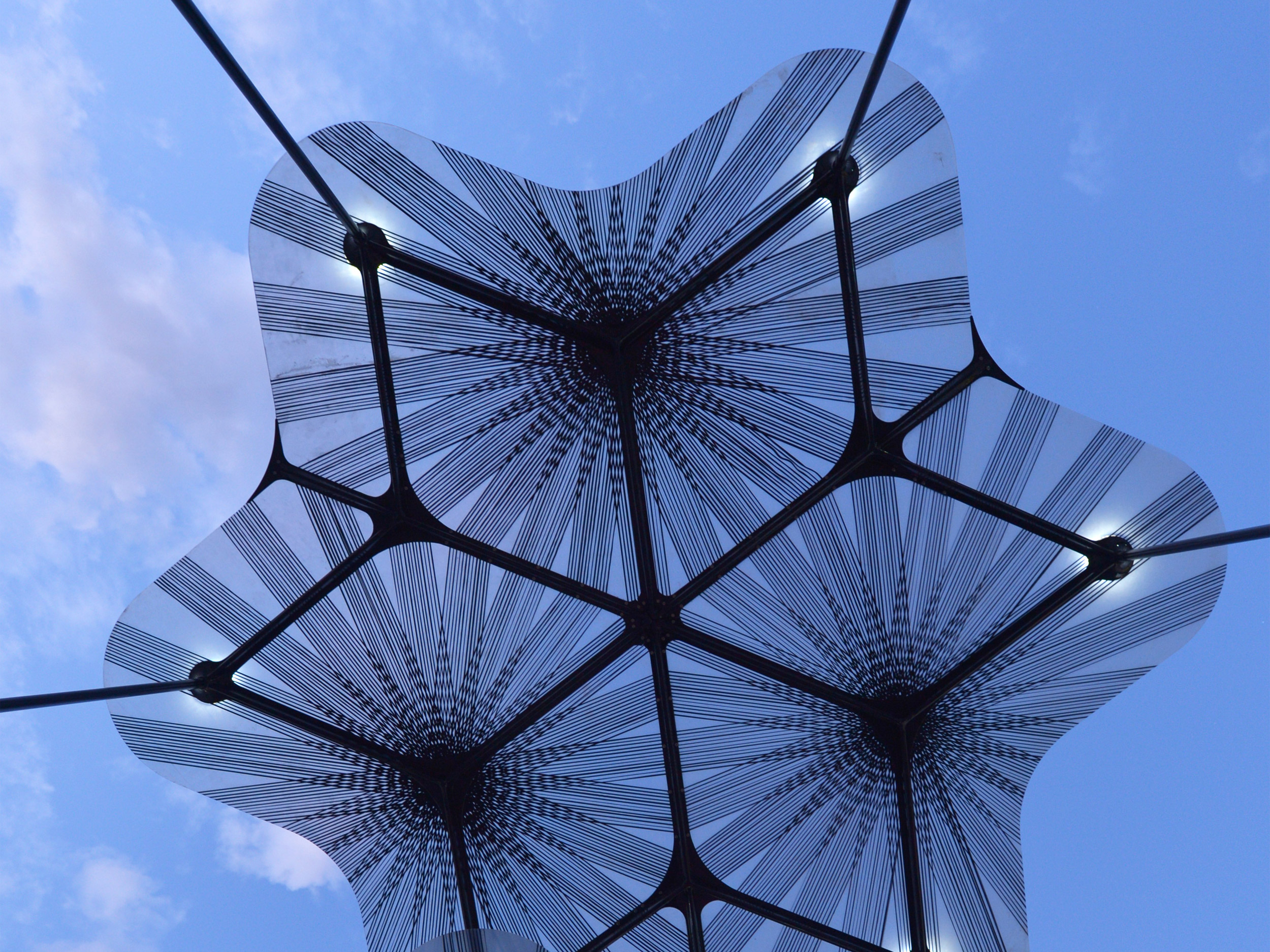 The 2015 design for the MPavilion aims to engage with both its surroundings and people. The structure looks similar to a flower with its multi-faceted design forming an overhead canopy.