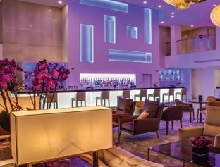 The refurbished lobby features ultramodern touches, including individual pod check-in desks. The double-height EDG Bar and Lounge (pictured) features British bespoke vanilla fabric suspended lights amid a decor of muted grey fabrics and splashes of yellow.